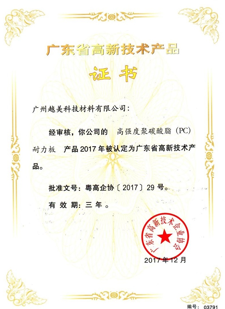 廣(guang)州越美科(ke)技材料有限(xian)公司,始創于1991年,至今有30年歷(li)史,公司根據產(chan)業創新變革升級曾(ceng)用名注冊6個,現公司名為第六代,是目(mu)前國內專業生產(chan)聚碳酸酯PC陽光(guang)板,PC耐力板,具有獨立知識產(chan)權、具備(bei)進出(chu)口資格和(he)一(yi)般納稅人資格的(de)產(chan)、供、銷一(yi)體化的(de)中型民營企業。